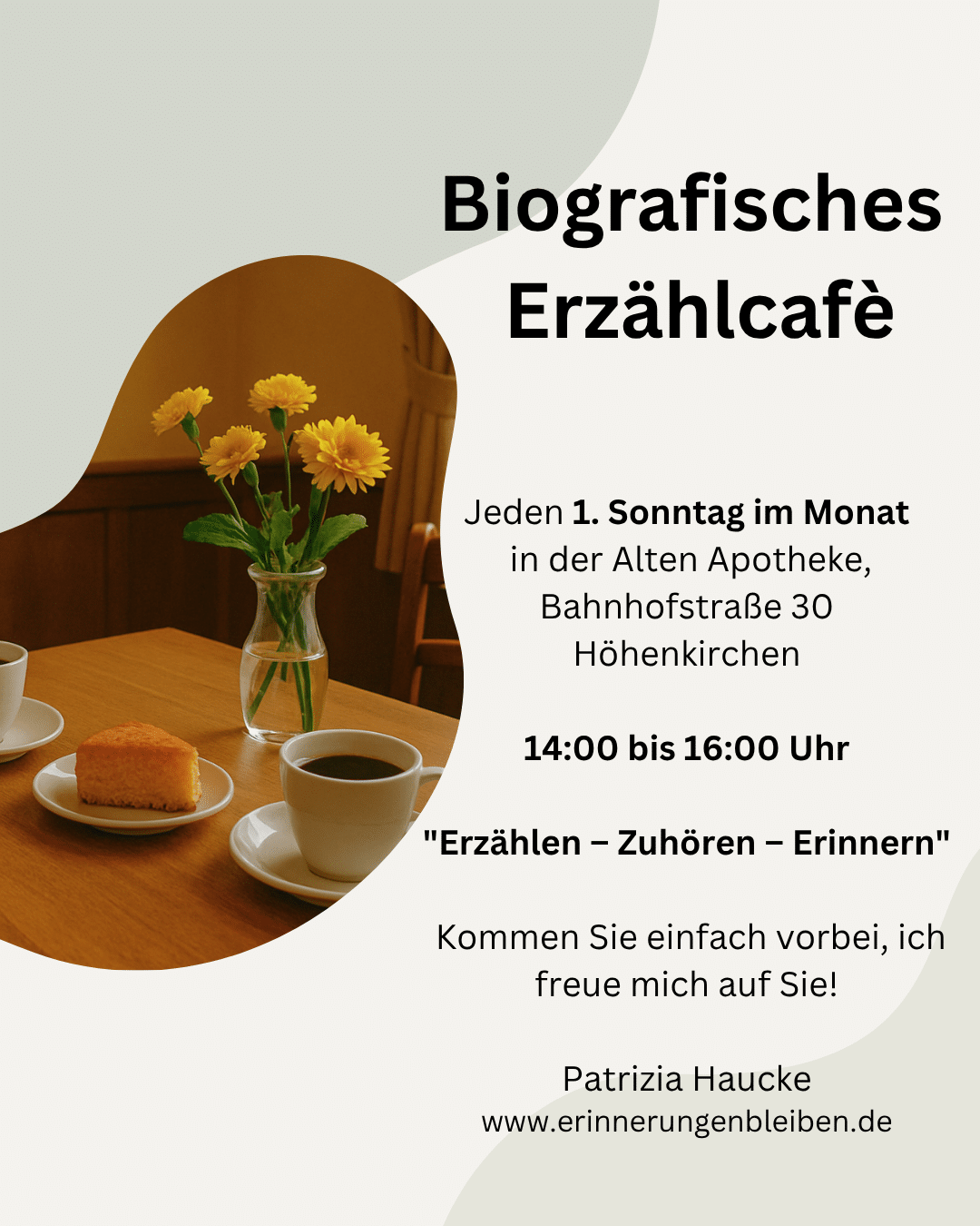 Ab sofort laden wir euch herzlich zu unserem biografischen Erzählcafé ein – immer am ersten Sonntag im Monat von 14:00 bis 16:00 Uhr in der Alten Apotheke. Leitung: Patricia Hauke.